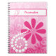 Personalize adicionando seu nome a este notebook espiral giro e rosa com uma imagem de flores retrorreflectoras cor-de-rosa brilhante e cordas giratórias de miçangas. Um bonito desenho de borboleta é colocado ao lado da caixa de nome personalizável. Perfeito para uma adolescente que ama acessórios para ser bonito em rosa, ou um excelente de volta para o presente da escola.