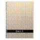 Digite seu nome em letras maiúsculas ou você também pode usar um estilo de fonte e uma opção de espaçamento de fonte diferentes. Crie sua própria foto metálica de cor amarela dourada personalizada e foto metálica de folha metálica branca do estilo clássico grego design. A folha metálica é um efeito fotográfico impresso. Um caderno espiral personalizado para o trajeto de volta à escola de um estudante universitário. Transfira o design para outro notebook ou planejador de estilo.