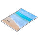 Um caderno espiral personalizado com uma fotografia de uma clara cena de oceano azul com ondas suaves ao longo de um litoral e areia castanha macia. Um céu azul com nuvens fofinhas à distância. Paisagem serena tropical idílica.