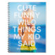 Caderno de foto personalizado com o texto "coisas fofas, engraçadas, malucas que meu filho disse" em branco (cada linha de texto pode ser alterada para qualquer cor clicando no botão para editar o design) e o nome do seu filho ou filha. Envie sua foto favorita e obtenha um caderno exclusivo para você ou como presente para o papai e a mamãe.