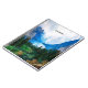 Um caderno com uma bela fotografia de uma cena agradável e tranquila da natureza. Floresta verde vibrante na frente e montanhas azuis sombrias nas costas. Com um céu branco nublado e sonhador. Mistura e mágica.
