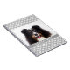 Modelo personalizável de foto de animal de estimação em uma cor de fundo de uma cinza que tem um padrão de impressões de pata de cão branco. Há também uma área de texto personalizável sob a foto para seu texto personalizado.