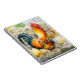 Um galo de galeria enquadrado por um bando de suas galinhas e feno em foco suave ao seu redor. Os amarelos e cinzentos gentis trazem o galo colorido para o centro da atenção, bem onde o pássaro orgulhoso gosta de estar. Este é um desenho mestiço em pasta de óleo e lápis colorido. Por Amanda Diehl, Designs Paxdomino