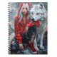 Bloco de notas da Gótica Girl and Wolf. © Desejos do Coração Escuro. Uma gótica está sentada ao ar livre com seu lobo branco neste cobrir notebook.