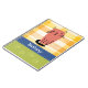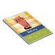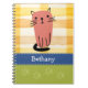 Um caderno bonito para amantes de gatos. Num fundo de verificação de aquarela amarelo e laranja, há um gatinho de rabanete laranja. Abaixo dele está uma banda azul com letras brancas para adicionar seu nome ou outro texto para personalizar. Abaixo está um espaço verde com estampas verdes claras.