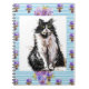 Caderno Espiral Gato Tuxedo Gatos Pretos e Brancos Flores Azuis