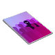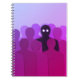 Notebook assustador com uma ilustração conceitual geométrica de um fantasma e sombra como uma figura humana numa multidão de pessoas. A pessoa diferente é uma figura escura e negra com olhos brilhantes. Ela se destaca pela multidão, que consiste em formas humanas roxas escuras. Embora sozinho, o diferente é feliz por ser um esquisito.