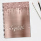 Notebook elegante e giro personalizado com rosa dourado falso brilho caindo sobre um fundo metálico esfregado de rosa dourado. Personalize com seu nome em um roteiro branco de tendência de na moda com baloiços.