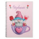 Este adorável notebook encadernado em espiral apresenta um gnomo engraçado com um bigode grande e barba comprida, sentado em uma equipe roxa com um coração cor-de-rosa. Ele está vestindo óculos cor-de-rosa e um chapéu listrado vermelho e branco com uma borda azul. Ele está segurando uma rosa vermelha e um chocolate cardíaco. É personalizado no topo com o seu nome com um rosa em forma de coração em ambos os lados.