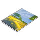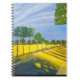 Golden Fields and Path captures a peaceful countryside road where vibrant yellow fields meet deep, long tree shadows under a soft blue sky.