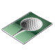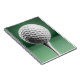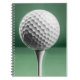 Notebook espiral com uma imagem de alta qualidade de uma bola de golfe branca sobre uma mesa branca em frente a um fundo verde.