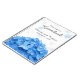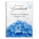Livro de convidado de casamento com flores azuis de hydrangea e texto preto personalizado. Por favor, assine nosso guia com nomes e data de casamento na frente. Vazio, páginas com linha dentro. Espiral amarrado, ficará plano.