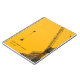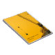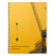 Um caderno minimalista com tema de construção que apresenta um design simples em monocromia preto e amarelo. Ele apresenta um guindaste de construção em silhueta em primeiro plano com uma assinatura simples da empresa no canto inferior.