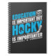 O notebook temático engraçado de hóquei com textos azuis e brancos em fundo preto diz que Educação é importante, mas hóquei é importante!