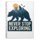 Uma silhueta de urso forte, formando uma cena de montanha tranquila com pássaros em voo, evocando um senso de aventura e liberdade. "NUNCA PARE DE EXPLORAR" enfatiza a resiliência e a descoberta.