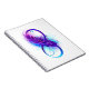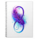 Símbolo infinito com uma bela pena pintada em cores roxas e azuis brilhantes sobre fundo branco.