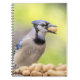 Um jay azul com um amendoim no bico, sentado atrás de uma pilha de amendoins. Essa imagem foi tirada em Ticondeprecia, NY (os Adirondacks) por Debbie Quick of Debs Creative Images. Para ver mais fotografias por Debbie, visite o seu site: www.debscreativeimages.com
