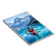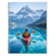 Notebook with an illustration of a man kayaking in the ocean by the snow topped mountains. Pretty serene blue tranquil water and pine trees surround him on a peaceful journey.