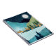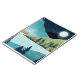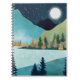 Uma bela paisagem com texturas únicas mostrando uma paisagem de lago de montanha com lua ascensão e céu estrelado em tons de azul, ouro, verde e turquesa.