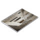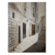 Caderno com uma foto com a lavanderia que consiste nas coberturas brancas que penduram para secar no sol na fachada de uma casa de pedra branca em um beco com escadas do arenito em uma cidade em Italia, criando opinião italiana/mediterrânea típica da rua.