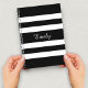 Notebook de ligação espiral com um padrão listrado preto e branco e impressão de nome personalizado branco no lado frontal.
