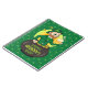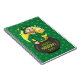 Notebook com ilustração de um duende sorridente vestindo um terno verde, uma gravata arco e um chapéu de boliche enquanto sentado dentro pote o’ ouro e segurando uma caneca de cerveja, com arco-íris amarelo, verde e laranja no fundo. A imagem é colocada sobre um fundo verde-escuro sem descontinuidades, com pinceladas. Uma design perfeita para celebrar o Dia de São Patrício!