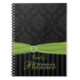 Esta cinza personalizada e damasco preto com o bloco de anotações do planejador de casamento de listras tem uma fita IMPRESSA em verde limão e uma joia de diamante IMPRESSA nela, e um texto personalizável que você pode alterar para atender às suas necessidades.Envie um e-mail para niteowlstudio@gmail.com se precisar de assistência.