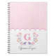 Adicione um toque feminino ao seu trabalho diário com este lindo caderno espiral que apresenta delicadas flores cor-de-rosa e pêssego, um padrão de listras cor-de-rosa, uma borda com uma ondulação na moda, passarinhos fofos e um monograma personalizável. Modifique a inicial e o nome para criar um presente único para familiares, amigos, colegas de trabalho ou estudantes. Quer você o use para anotar notas, acompanhar tarefas de casa, desenhar ou escrever um diário, este caderno será um complemento perfeito para sua área de trabalho ou bolsa escolar.