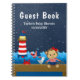 Este bonito e divertido livro de hóspedes apresenta um macaco-marinheiro náutico num convés de madeira com uma gaivota e um caranguejo. Ao fundo há um farol vermelho e branco, um pássaro giro em um veleiro, ondas oceânicas e um céu azul marinho estrelado à noite. O texto combina fontes em negrito e sem serifa para uma aparência na moda e moderna. Isto é perfeito para um chá de fraldas temático náutico.
