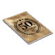 Bloco de notas de 50 anos estilo folha de ouro, com logotipo comercial e ano. Ideal para o chefe e funcionários ou como fornecimento de promocional para clientes. Design comemorativo com galho e estrelas. O logotipo pode ser alterado para texto clicando no botão para editar o design.