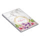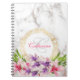 Um caderno espiral com uma elegante textura de mármore em branco. A camada sobre o topo é uma moldura circular com borda decorativa dourada. Flores grandes, cor-de-água, cor-de-rosa e púrpura, magnólias, com sotaques verdes, enfeitam o design. Personalize com seu nome e monograma.