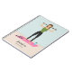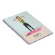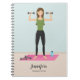 Este notebook apresenta a ilustração de desenho animado de Destei de uma menina morena que está levantando pesos. A menina tem um cabelo castanho longo, sua camisa é verde e suas leggings são pretas. A garota está parada em um tapete de exercícios cor-de-rosa que tem campainhas e uma garrafa d'água nele. Sob a imagem, há áreas de texto personalizáveis para o título do notebook.