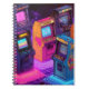 Um grupo de máquinas de fliperama vintage fica iluminado por luzes de néon vibrantes. A cena é colocada contra um pano de fundo de uma galáxia estrelada, criando uma atmosfera nostálgica, mas futurista.