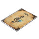 Mechanical clef and flowers to the beat of the clocks. A steampunk-style treble clef, rendered in dark metal with bronze accents and intricate detailing. The clef is adorned with blue flowers that have clock faces at their centers, adding a whimsical touch. Musical notes float near the clef, and small droplets hang from its curves.