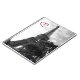 Meu coração vai para Paris. Imagem em preto e branco da Torre Eiffel com um coração simples nas cores nacionais francesas.