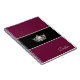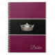 Notebook mostrado com um gráfico de uma coroa de cinza prateada com uma estrela em fundo de vinho de ameixa e um nome personalizado. Personalize este item e mude o nome para o seu ou retire o nome e o comprar como está. Vinho de ameixa, cinzas de prata e colorações negras.