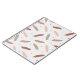 A soothing pattern of soft brown, beige, and tan feathers scattered on a textured white background, accented with small circular details for elegance.