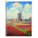 Notebook com pintura de Claude Monet em flores e moinhos de vento. Lindos e coloridos campos de tulipas vermelhas, cor-de-rosa e amarelas ao lado de um moinho de vento e casa na Holanda. Um presente de Monet excelente para fãs do impressionismo e da arte francesa.