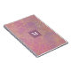Este notebook oferece um design elegante em linhas geométricas roxas, cor-de-rosa e douradas. Uma caixa roxa escura, no centro, oferece um monograma personalizado.