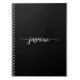Caderno espiral com nome monograma preto moderno e simples, e letra cursiva feminina. Este design minimalista de cor simples apresenta seu primeiro nome em uma linda tipografia de letra manuscrita com cauda em espiral branca sobre fundo preto e fácil de personalizar. Ótimo presente personalizado feminino para festa de aniversário, festa de aniversário de 16 anos, casamento, chá de noiva, chá de bebê e para quem ama um estilo minimalista bonito.