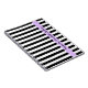 Caderno personalizado que caracteriza um teste padrão de listras preto e branco. Através de é uma banda roxa com texto customizável. Adicione um nome ou o outro texto. Design elegante, contemporâneo para mulheres.