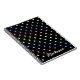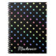 Este lindo notebook personalizado apresenta um design colorido. As bolinhas arco-íris são impressas na frente sobre um fundo preto. Um nome de exemplo é impresso perto da parte inferior, que você pode personalizar para incluir seu próprio nome personalizado ou texto.