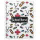 Enfermeira da escola A diversão de padrões médicos anota o notebook Spiral. Historial médico com seringa, ligaduras, medicação e cruzes vermelhas. O texto lê NURSO ESCOLAR e pode ser personalizado com outras informações. Dons de enfermeira de escola divertida.