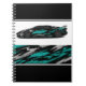 O notebook é mostrado com uma impressão de foto de um carro de corrida automotiva. Personalize este item ou comprar como está. Imagem do stock vecteezy.com