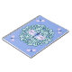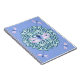 Belo caderno de libélula mandala. Possui uma mandala azul de gelo com quatro libélulas de cor d'água roxa e azul nas laterais da mandala e uma grande libélula no topo do centro da mandala. Fundo azul/roxo.