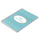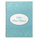Notebook mostrado com um gráfico de estrelas petitas em ouro sobre fundo azul-céu com a frase "Notebook de noiva" dentro de forma oval com bordas coordenadoras. Personalize este item e mude o nome para o seu ou retire o nome, altere as cores da estrela no filtro, na cor de fundo ou no comprar como está. Ouro, cor branca e azul-céu.