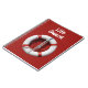 Fotografia de um anel de vida vermelho e branco pendurado em fundo de amora. Texto personalizável, "Guarda de vida" gravado acima.