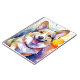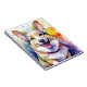 Uma imagem de arte digital de um Corgi vibrante com ouvidos grandes e expressivos e uma expressão feliz domina a imagem, rodeada por cinzas coloridas de água. O plano de fundo apresenta explosões dinâmicas de azul, amarelo e laranja, acrescentando uma sensação divertida e enérgica.