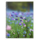 Um campo de flores de milho em tons de azul profundo e pálido, roxo, lavanda e rosa, com folhas verdes pálidas.