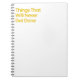 Um caderno espiral viciado com texto amarelo arrojado em branco, lendo "Coisas que Nunca Serão Feitas". Ideal para procrastinadores, estudantes, ou qualquer pessoa que ama uma boa risada enquanto listas de fazeres que ignoram.